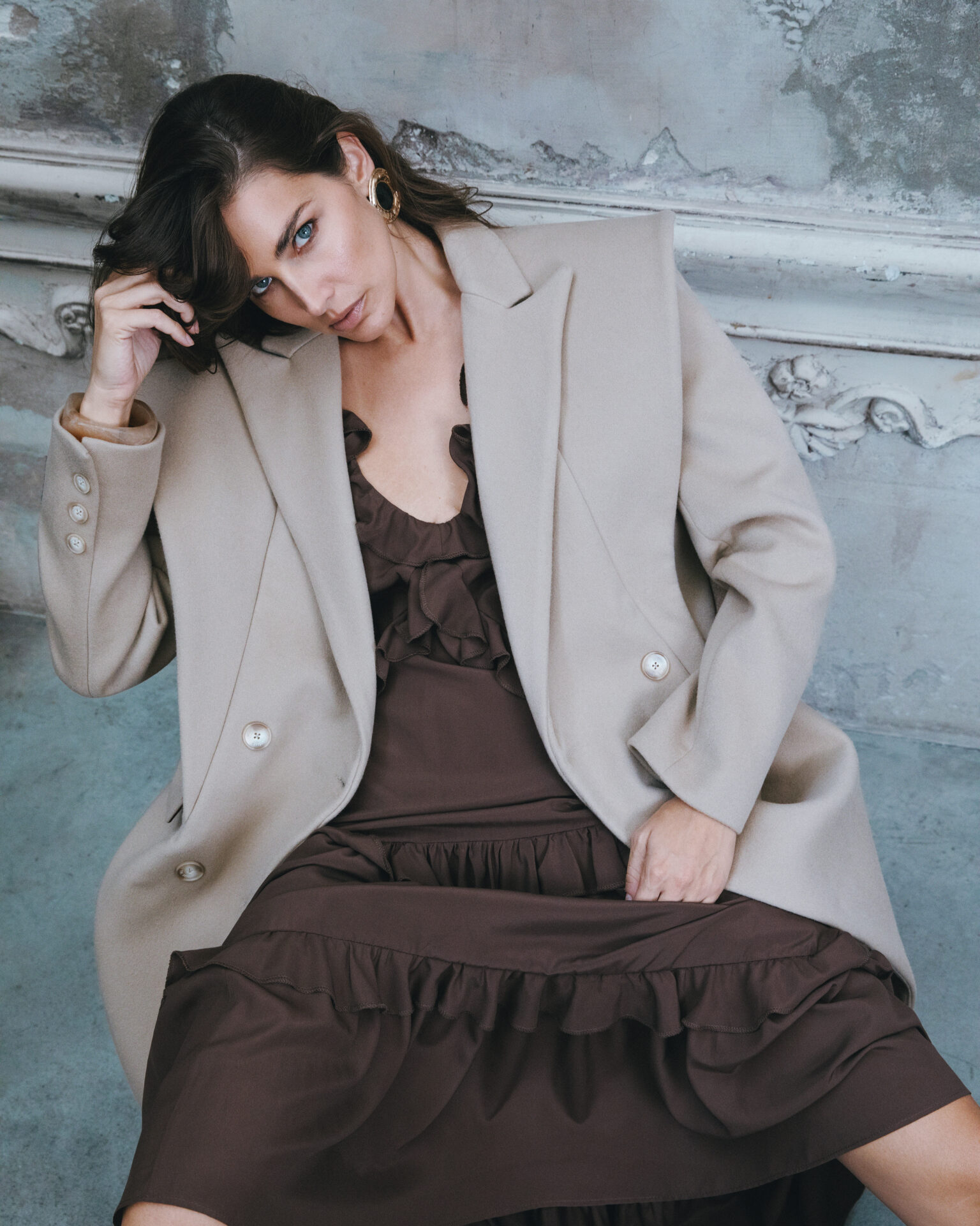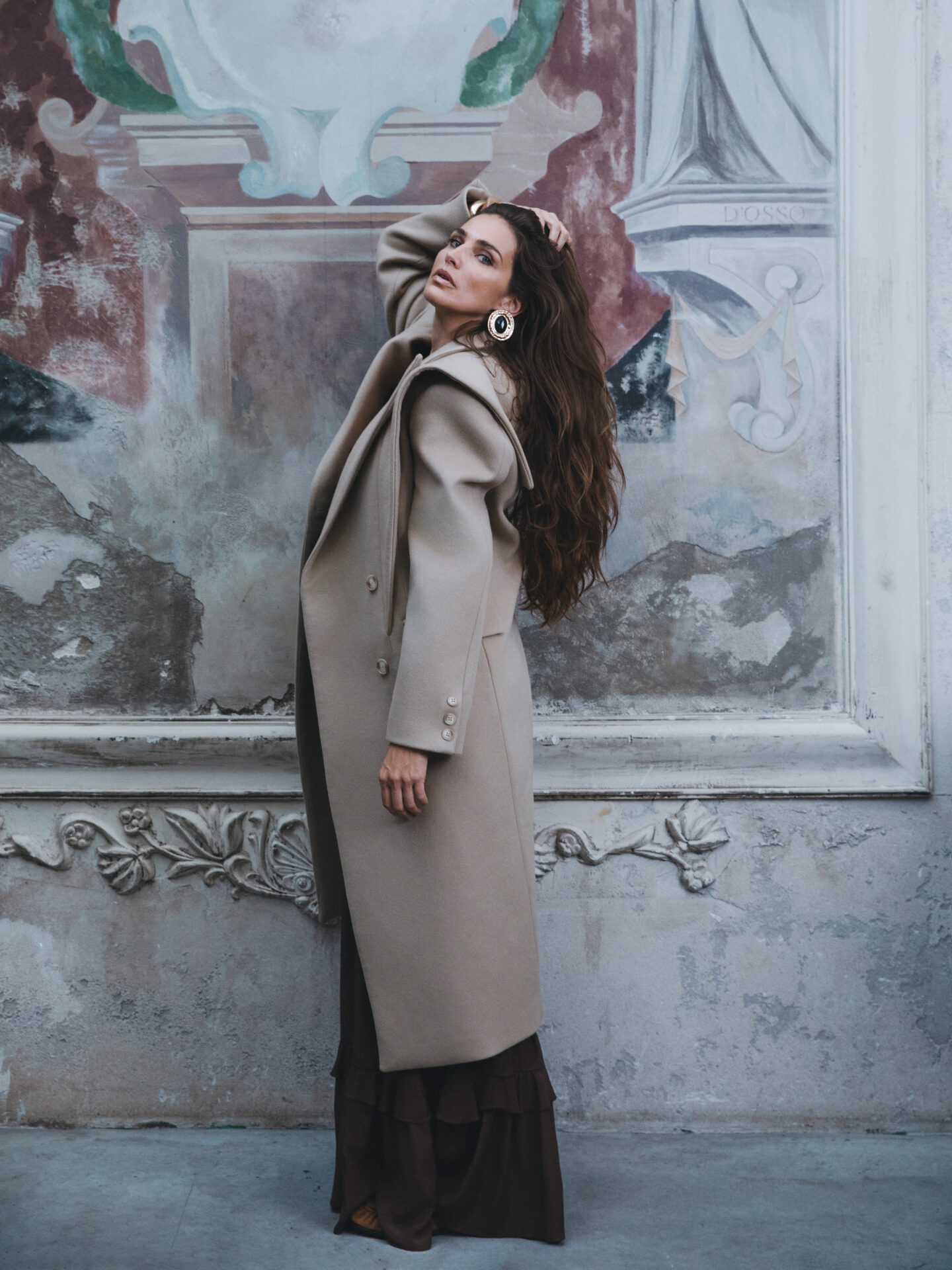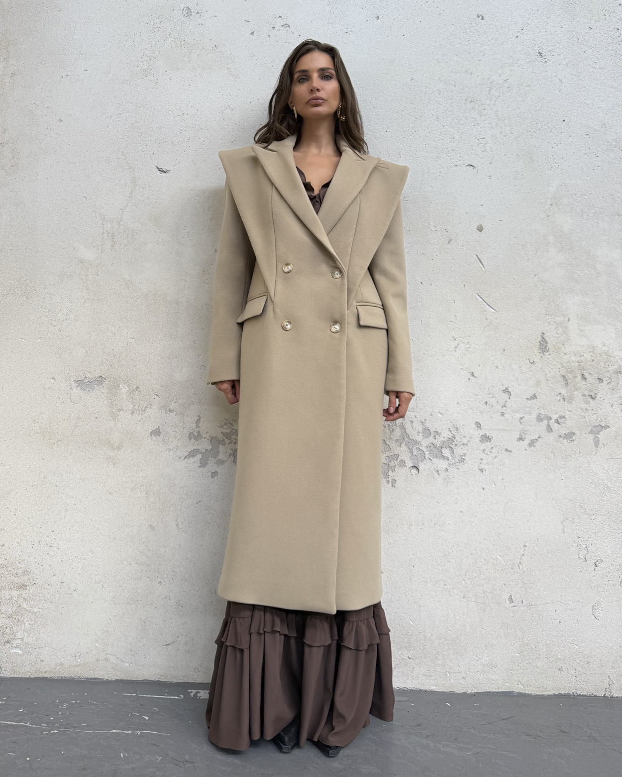 A long double-breasted coat crafted from 100% wool, defined by bold shoulders and oversized lapels. Its double collar adds a distinctive edge, giving this piece both structure and character. Designed to transition seamlessly—from everyday wear to evening dressing—it stands as the statement of our Autumn/Winter collection.