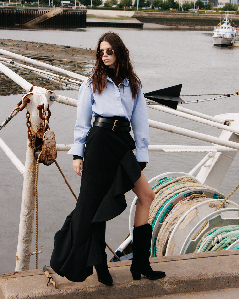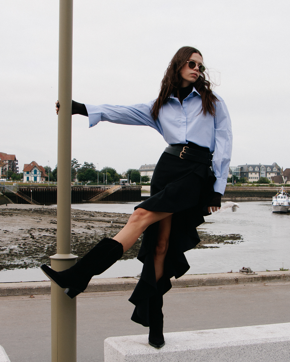 Suknja sa velikim dubokim šlicem koji je ukrašen zanosnim karnerom celom dužinom šlica. Skriveni bočni rajsfešlus.