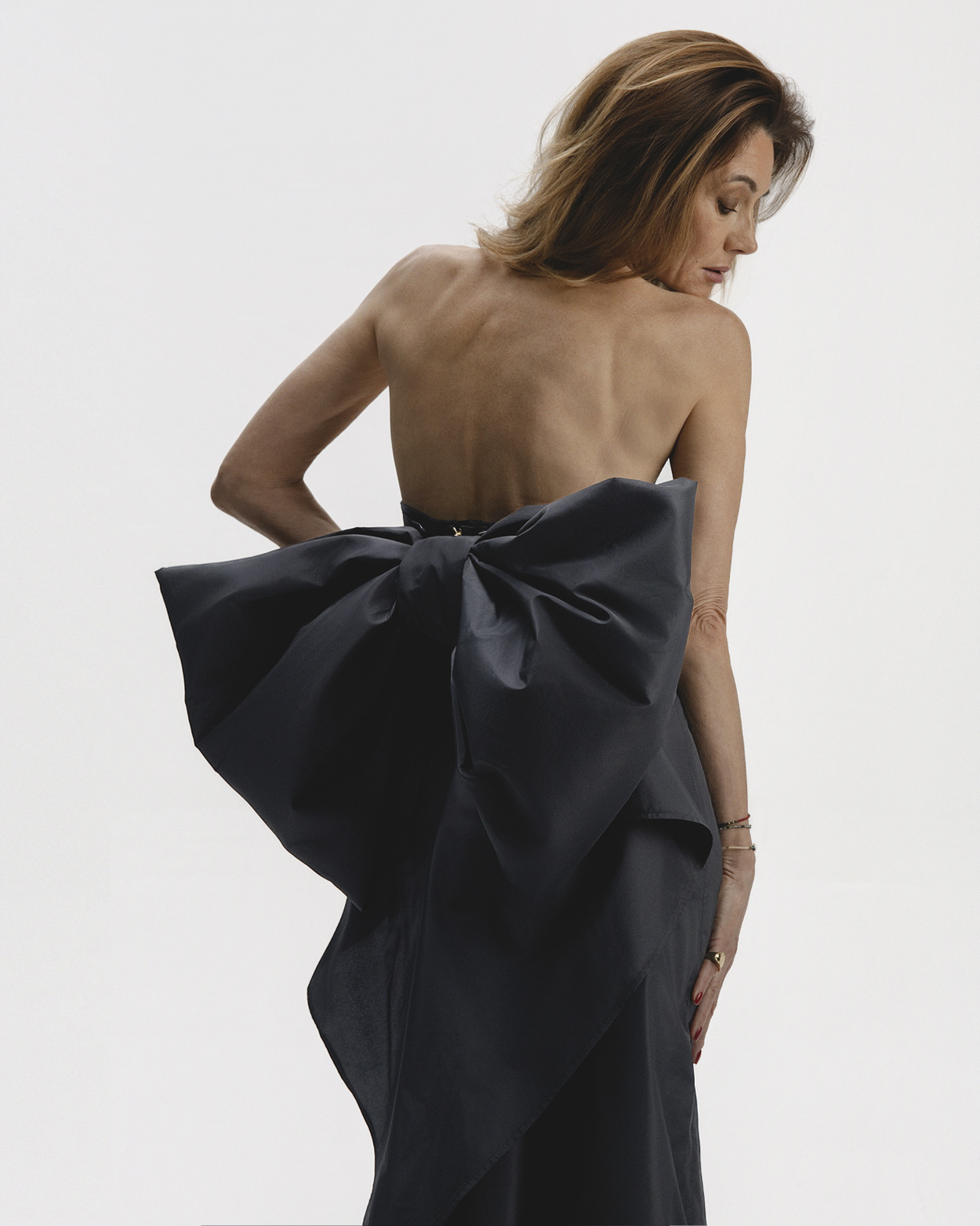 Haljina od chantung svile koja nosi suptilnu romantiku u svojoj jednostavnosti. Prednji deo prati liniju tela ravnim krojem, dopuštajući materijalu da govori sam za sebe. Nazad, otkriva se skulpturalna mašna postavljena iznad zlatnog rajsferšlusa koji diskretno hvata svetlost. Mašna se može ukloniti, čime haljina dobija smireniju, svedeniju verziju.