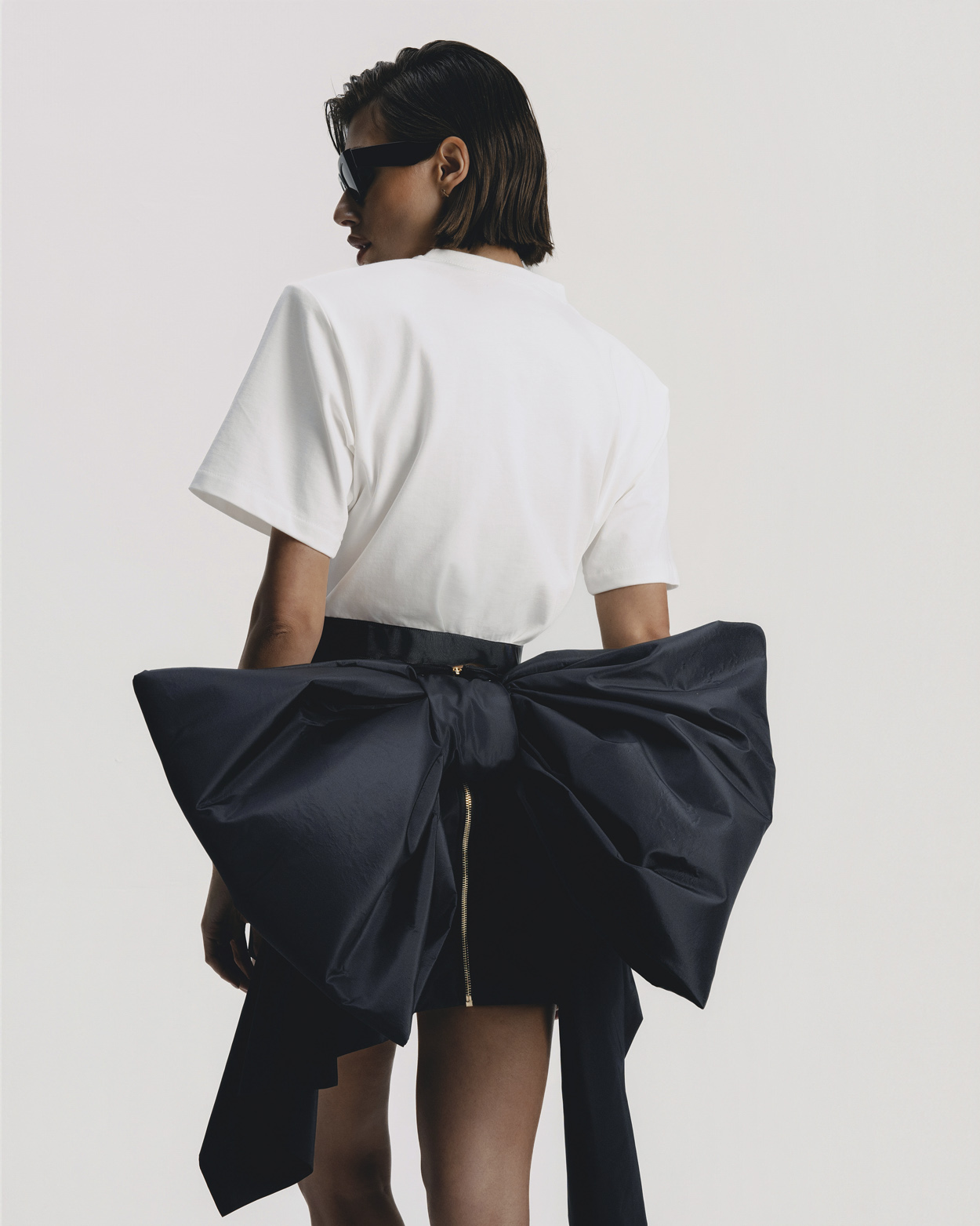 Padajući u čistoj, ravnoj liniji, suknja odiše blagom romantikom. Na leđima se pojavljuje skulpturalna mašna iznad zlatnog metalnog rajsferšlusa — detalj koji daje poseban karakter. Mašna se može ukloniti, otkrivajući smireniju, svedeniju verziju suknje. Izrađena od chantung svile, lagano prati pokret i ostaje nežna u svakom koraku.